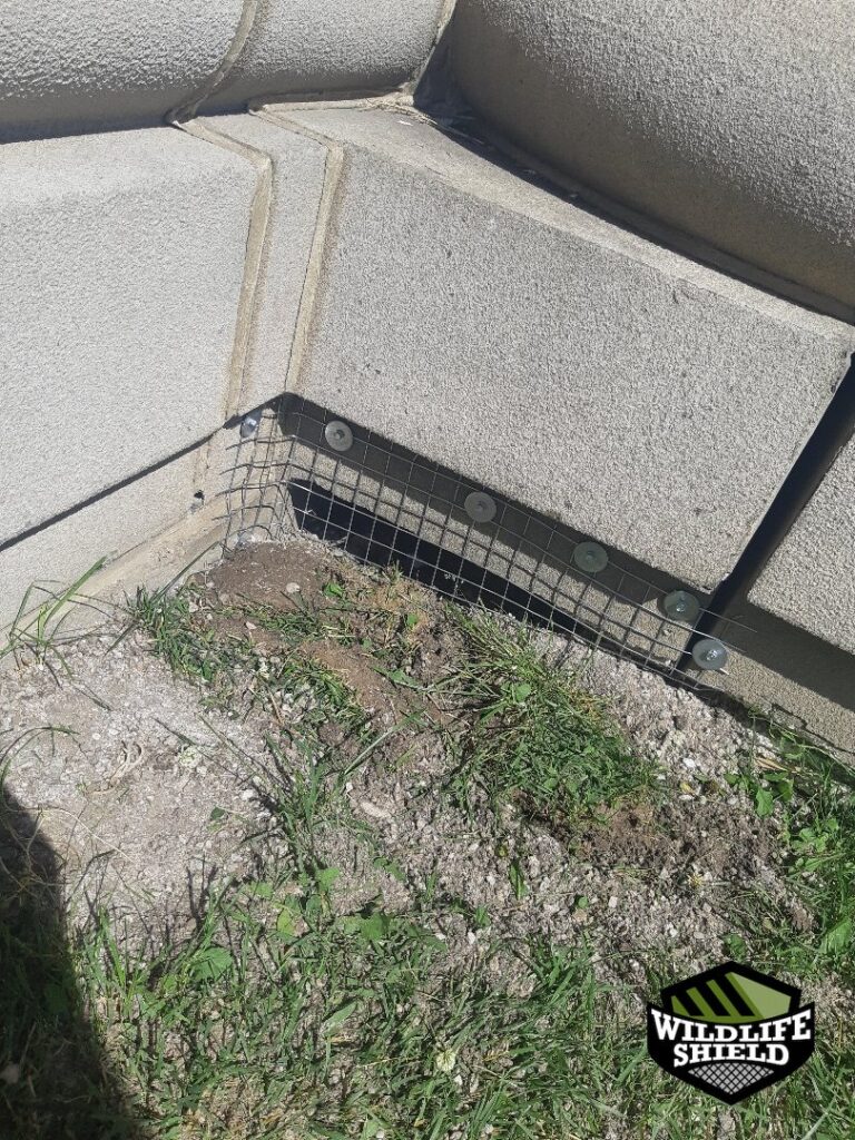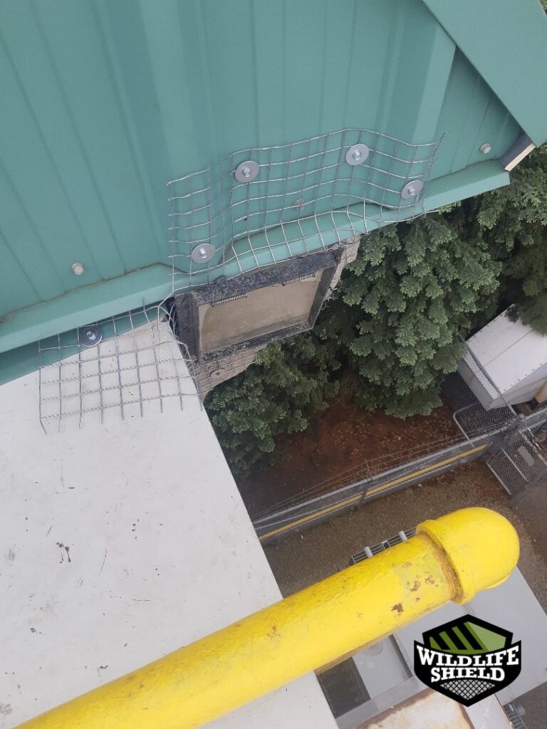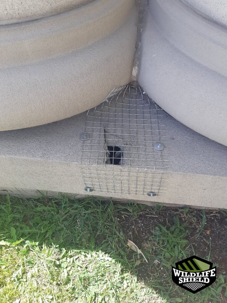 Once raccoon activity had ceased, all one-way doors were removed. Heavy-gauge galvanized screening was installed over the identified openings, including roofline gaps, pillar joints, and lower wall voids. The screening was mechanically fastened and contoured to the structure to provide long-term exclusion while maintaining building integrity.