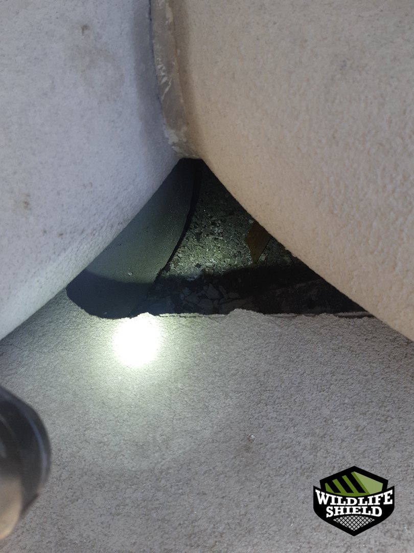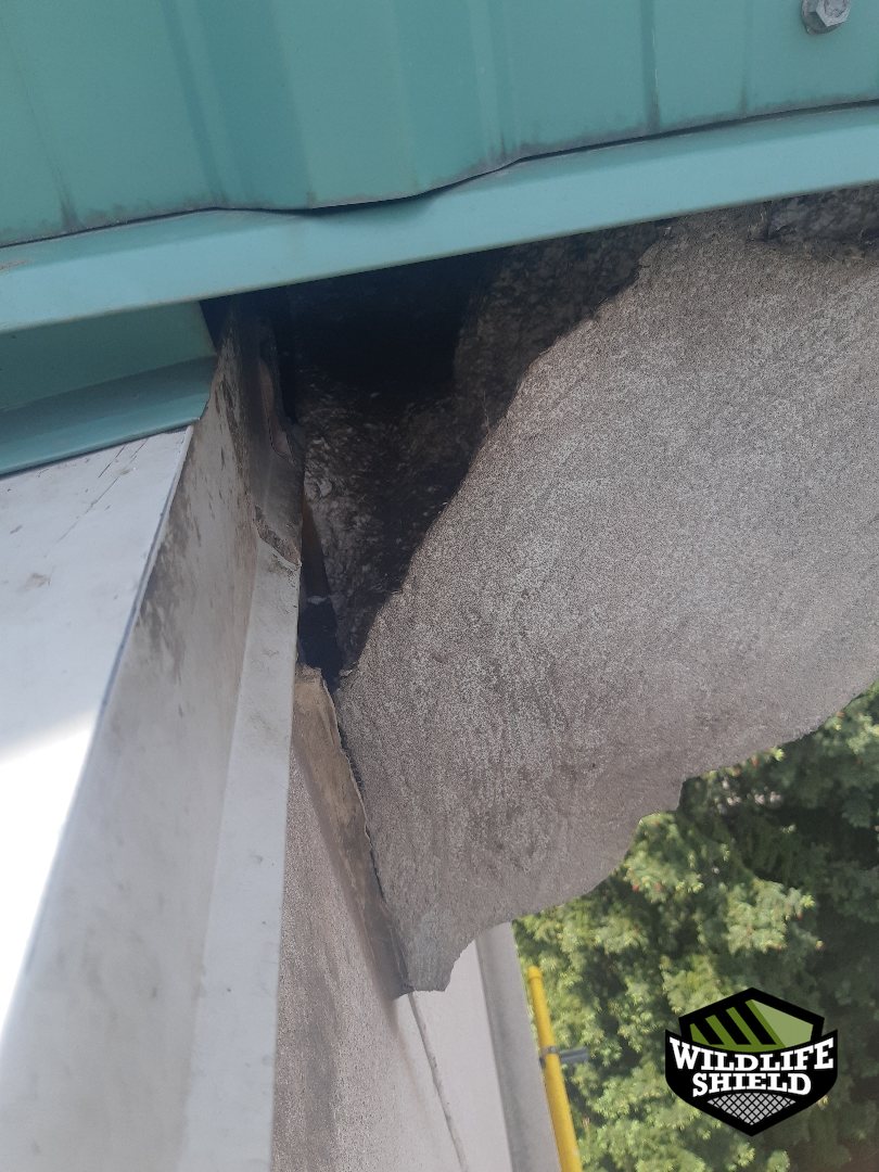 During the initial inspection, our technician identified damage at the junction where the concrete wall met the metal roof. The opening was large enough to allow raccoon access and appeared to be an active entry point.