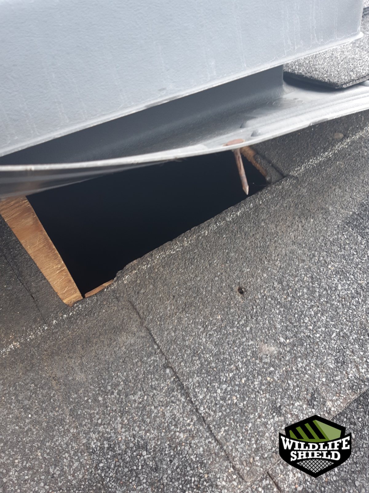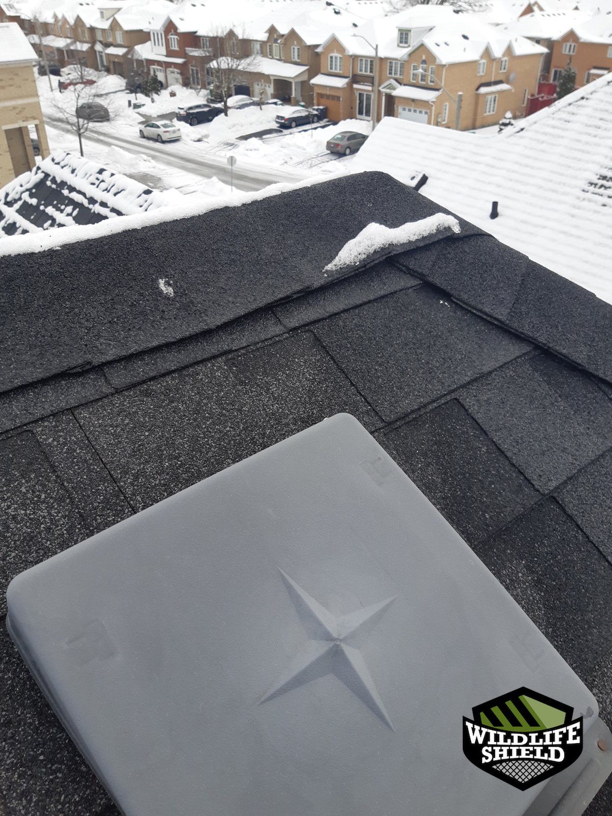 Our inspection identified a damaged roof vent being used as the primary entry point. The surrounding roof area showed signs of wear, and additional roof vents and soffit intersections were assessed as vulnerable secondary access points. Due to roof height and winter conditions, a two-technician approach was used for safety.