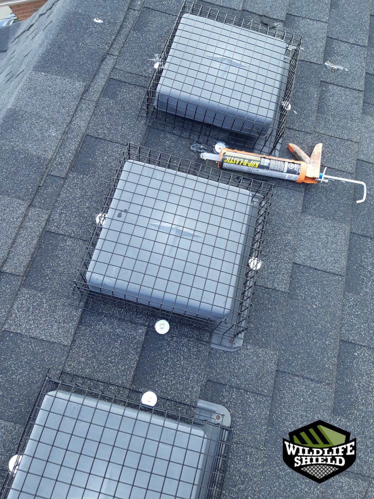 Photos taken during and after installation show vent cages, soffit screening, and sealed roofline transitions.