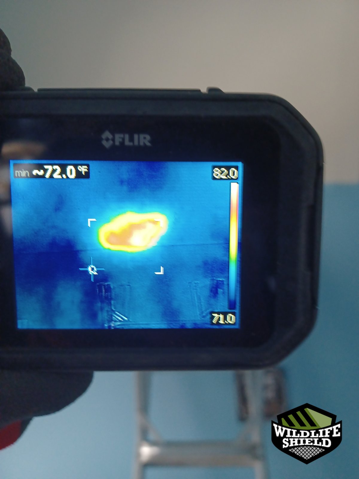 Initial exterior inspection identified a primary entry point at a soffit intersection. Interior attic inspection confirmed wildlife presence; however, raccoon young were not immediately visible during the first visit. Subsequent inspection using thermal imaging later identified concealed heat signatures consistent with raccoon kits behind finished drywall.